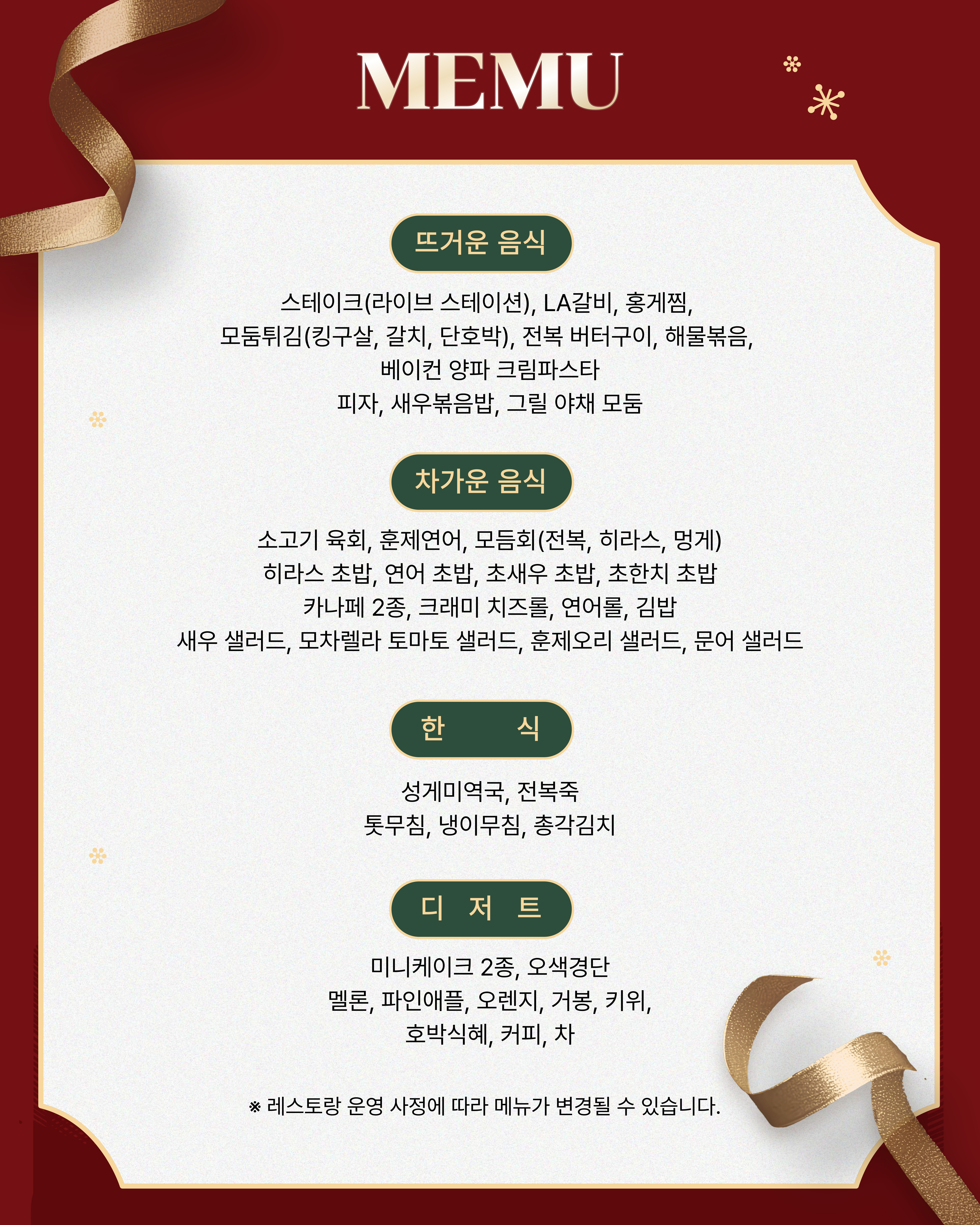 - 레스토랑 운영 사정에 따라 메뉴가 변경될 수 있습니다.